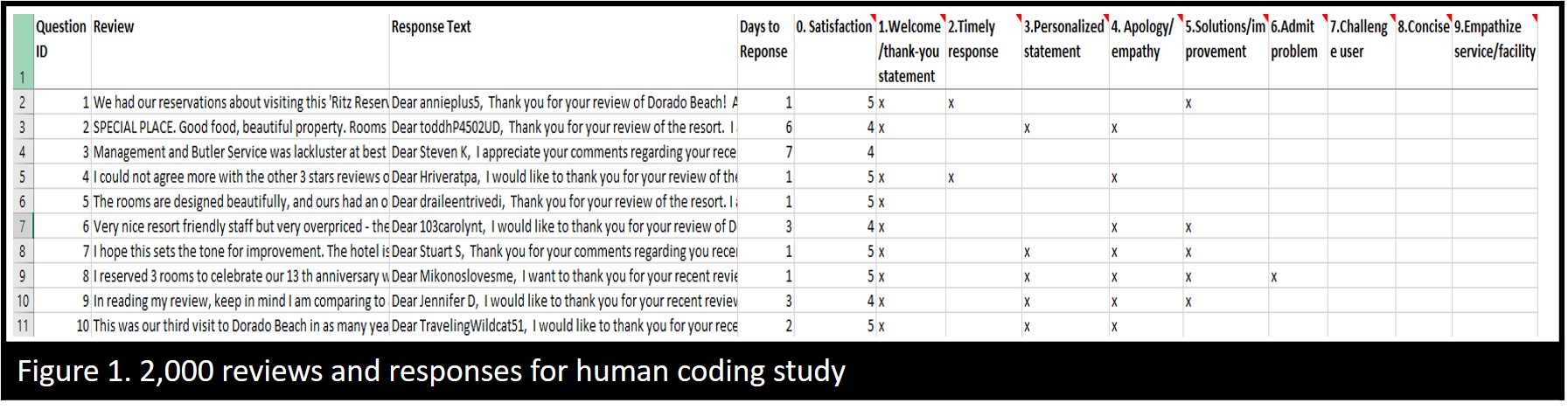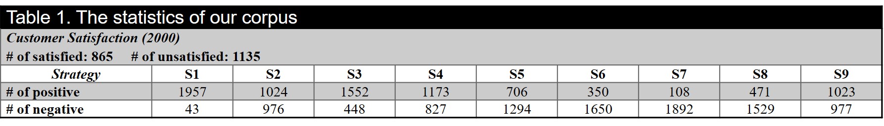 To the best of our knowledge, there is no public dataset for the tasks. For this reason, we randomly sample two thousand instances from the collected data to establish the corpus for model development and performance evaluation (see Figure 1). To develop the model, we requested three human coders with over five years of online hotel booking experience to involve the data compiling process. We randomly selected 1,000 positive and 1,000 negative hotel reviews with responses from nine hotels. Three human coders are proficient in English, and each coder receives a $200 monetary reward to complete this study in a month. Three coders were trained with sample reviews and responses before conducting the labeling task. The definition of each strategy was given to each participant. Given the hotel reviews, responses, and days to respond, participants were asked to mark response strategies used in each hotel response and rate their customer satisfaction toward each response. A 5-point Likert scale with 1= strongly unsatisfied and 5= strongly satisfied is used to measure users' satisfaction. We used Cohen's kappa coefficient to measure inter-rater reliability. The kappa value is .75, which indicates a substantial agreement among the three raters. The data distribution is shown in Table 1.
